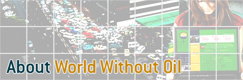 WORLD WITHOUT OIL simulated the first 32 weeks of a global oil crisis. It established a citizen “nerve center”to track events and share solutions. Anybody could play by creating a personal story – an email or phone call, or for advanced users a blog post, video, photo, podcast, twitter, whatever – that chronicled the imagined reality of their life in the crisis. The WWO site at worldwithoutoil.org (archived here) links to all these stories. The game encouraged excellence with daily awards and recognition for authentic and intriguing stories.