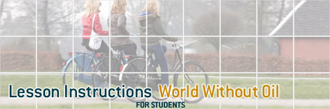To use these lesson plans, you should have free access to the Internet. To go straight into the player stories in the World Without Oil game, start at WWO in the Wayback Machine at the Internet Archive.